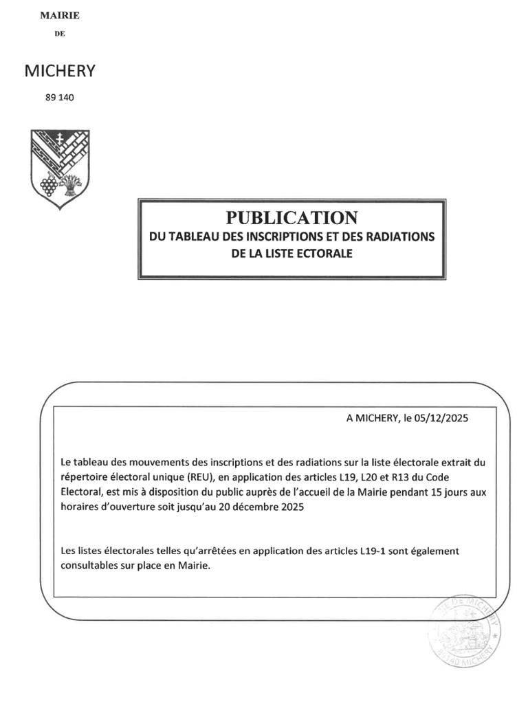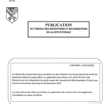 Le tableau des mouvements d’inscriptions et de radiations sur la liste électorale est mis à disposition du public en mairie pour consultation.