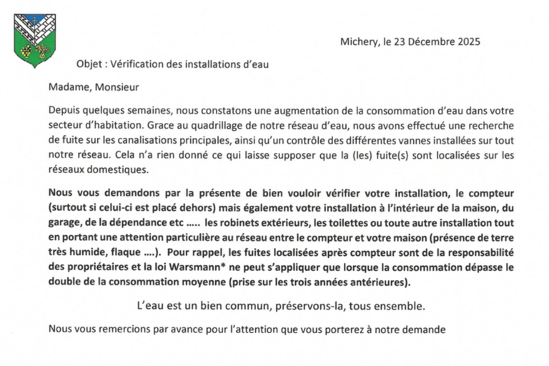 Une augmentation anormale de la consommation d’eau a été constatée dans certains secteurs de Michery. Les habitants concernés sont invités à vérifier leurs installations.